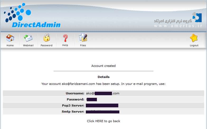 9- مشخصات اکانت ایمیل بعد از ساخت از طرف سیستم به نمایش در خواهد آمد بر روی Click here to go back کلیک کنید تا به صفحه پیشین بازگردید.